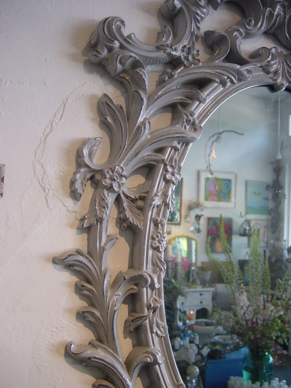 The above mirror was a bit more complex of a project. Again, it’s an awesome Turner piece that was painted hideous gold. I cleaned up all the curves and crevices with a toothbrush and painted it a matte black. After that dried, I added a coat of semigloss Winter Gray. When that dried I used heavy grit sandpaper on the high areas to lightly sand off the layers of paint until I liked the way it looked. I try to sand the areas that would have naturally been worn away with time – the high points, edges, and sides. Think about the piece moving from home to home, and consider how damage (aka distressing) may occur. Layering the paint on the mirror gave it a really cool effect. The gold and black are visible under the gray. Most older pieces will have gone through several iterations of color, and you can mimic that by layering paint and sanding it away to reveal the various colors. I sealed it with a coat of poly to preserve the finished look.