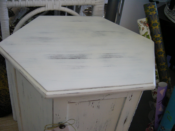 It’s important to decide whether you want to age your piece just a little bit or go all out and give it the French farmhouse look.The shelf above is lightly distressed. It’s a 1960’s Turner Home piece that was originally painted gold. I cleaned it with a soft toothbrush then spray painted it off-white. When it dried, I went over the high areas with a piece of medium grit sandpaper until I got the look I was going for. I then painted it with a light coat of water-based, matte polyurethane.
