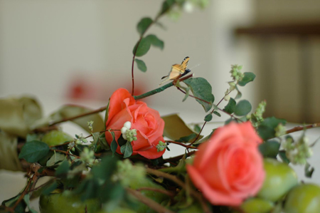 I was lucky enough to be given creative freedom on what to put together so I settled on vintage milk glass containers with raucous but feminine wildflowers. For the dining table, I did a spread of Persimmon branches with roses and a tiny butterfly, which, unbeknown to me, was a theme featured on the cupcakes!