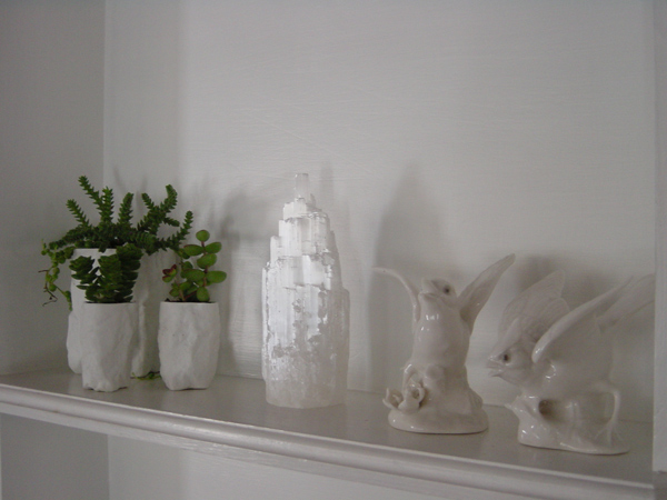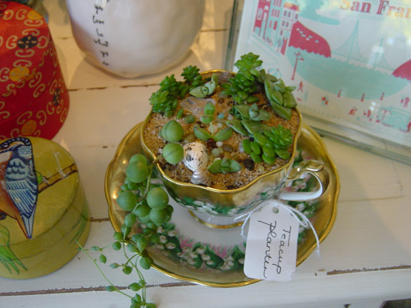 I’m not a huge fan of teacups. Giant collections of mismatched china can be beautiful, but since I am not prone to shabby-chic moments, you won’t find any rose-covered dandies in my home. I was inspired to create teacup gardens when I saw something similar at a nursery I love. Using cuttings of succulents from my bigger plants I make tiny gardens inside the cups and add a little animal of some sort – but it’s always tongue-in-cheek. I have a collection of vintage donkeys and elephants to choose from or I’ll use squirrels, pigeons, dinosaurs, etc. 🙂