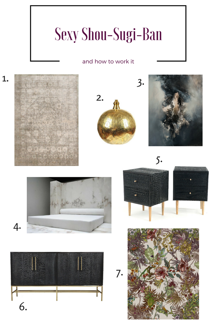 Designing with charred wood is on my design bucket list and my dream master suite would absolutely include it, along with natural stone and any art by the uber-talented Kim Kei. I put together a little inspiration board of the elements I’d include. Lots of organic materials, bold but minimalist forms and intricate prints.