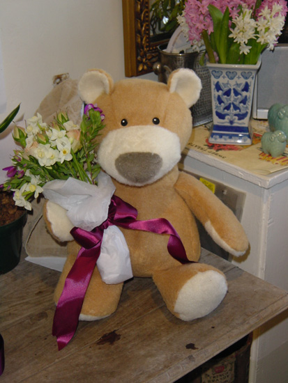 Valentine’s Day was lovely here at Apartment 46. While we did a lot of beautiful bouquets, we were also happily surprised to see so many people get creative with their gift-giving! I feel the same way most people do about the “Enforced Day of Love” (why is there just one prescribed day?), but if you’re going to participate, then taking a little extra time to do something out of the ordinary makes it much more worthwhile for everyone involved.We had a gentleman choose three items for the woman he loves because each had symbolic significance in their relationship. Miranda and I had the “AWWWW!” feeling for an hour after he left. We had a man and his daughter choose a few special things that reminded them of their special lady. It was completely sweet. We never ever get tired of being a source of inspiration for people and we are proud to be a part of a loving exchange. Our very good friend (and amazing chef) Axel challenged us to create a small bouquet that could be “given” by the stuffed bear she had bought her partner. We thought it was such a cute idea!