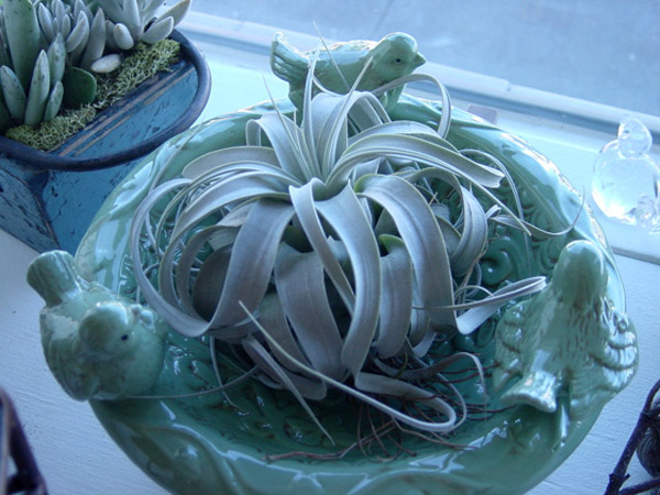 I keep a varied selection of air plants on hand in the shop at all times. I like to display them in tiny shot glasses, trapped underneath a glass cloche, riding in the bed of a toy pickup truck, or sitting happily inside of a miniature bird bath. They are the most flexible of all the plants I carry as they can sit just about anywhere. I am constantly arranging and rearranging them to suit my mood.