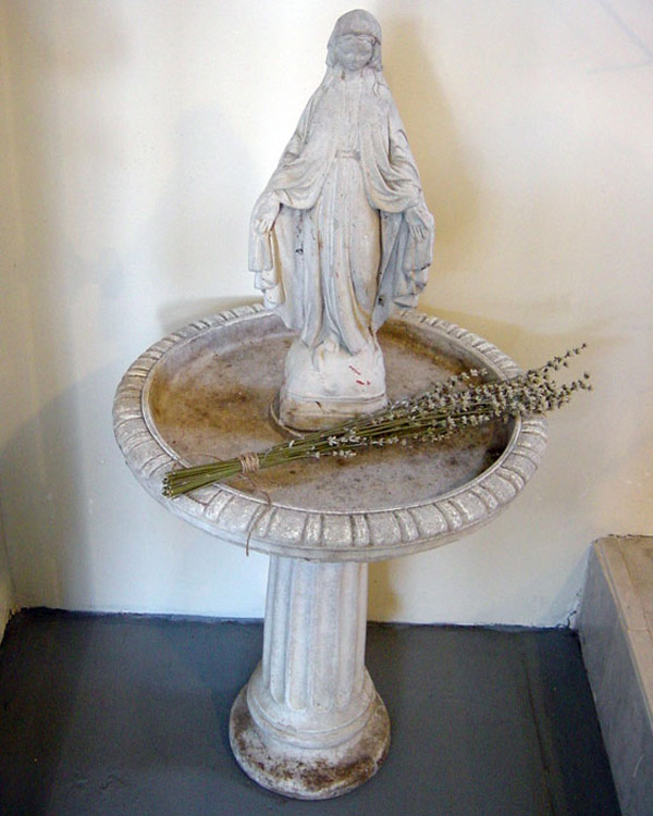 Among my other favorite Apartment 46 things is my 1960’s Virgin Mary bird bath, which up until last week displayed my Bonny Doon Farms beeswax candles. While it is of course made for the garden, I just love the idea that someone should take her home and use her indoors to hold candles, plants, maybe a collection of beautiful stones or something else organic. Her face is so serene that the fact she is a religious icon matters very little to me. I see her as art. I love using cement statues inside to create a kind of fantasy garden interior. It’s a little magical really – especially if you have hardwood floors.