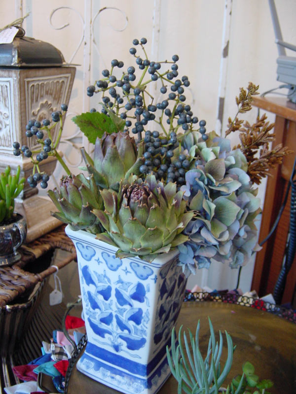 One of the things I most enjoy about floral design is coming up with unexpected arrangements. I have always had a little love affair with the baby artichoke as used in floral design but only recently decided that it is perfectly married to the hydrangea. Combining the two in a striking blue and white Chinese vase and popping in some blue berries and meadow grass made the whole thing feel kind of otherworldly to me. Something I would have on my own mantel or dressing table. I don’t tend to veer toward arrangements that are too soft or feminine. I like them to be weird. That’s really my number one criteria. If it’s pretty and weird, I’m sure to love it.