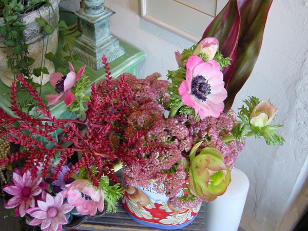 I loved the combination of the pink in these succulent blooms mixed with the tropical foliage and the blush pink anemones. In fact, right now is anemone madness at the SF Flower Mart and I can’t get enough of them!