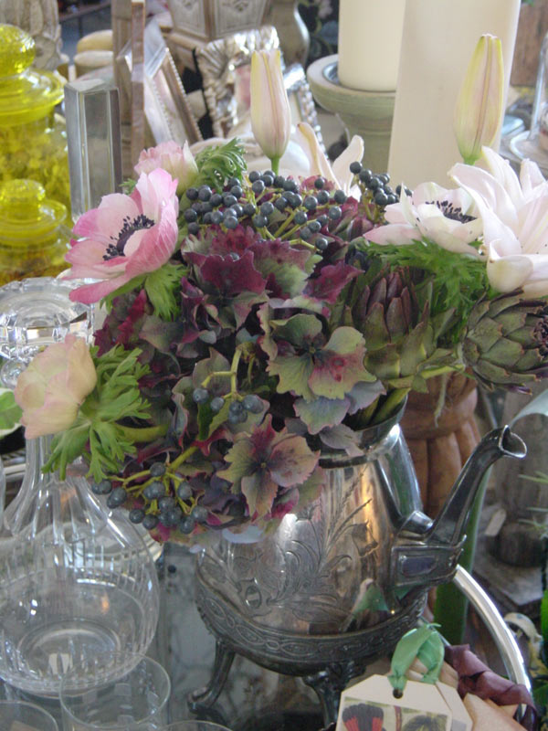 I am smitten with the way the flowers look against the tarnished silver of this antique teapot.