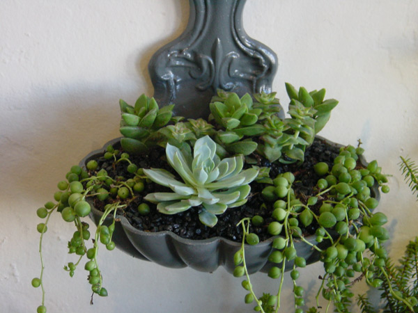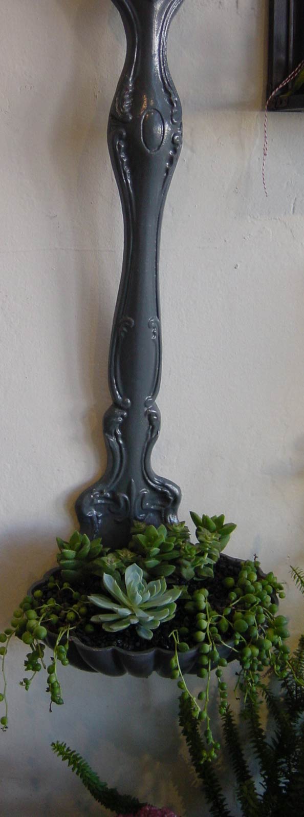 I’ve also been expanding my succulent gardens to include really strange “planters” that add whimsy and fun to any room they’re in. I found this 1960’s iron “spoon” at a flea market and painted and planted in it. I have no idea why someone would want to hang this on their wall without succulents in it so I just fixed an obvious dilemma (smile).