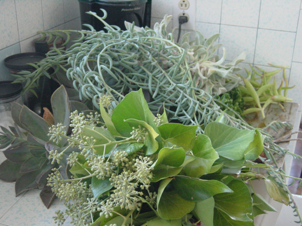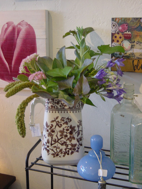 I was captivated by the strange alien shapes of the ivy blossoms and the soft-silvered leaves of my Lamb’s Ear. Many people don’t realize that if you leave Lamb’s Ear cuttings in water, they will root! It’s an awesome way to create long-lasting green- oriented arrangements.