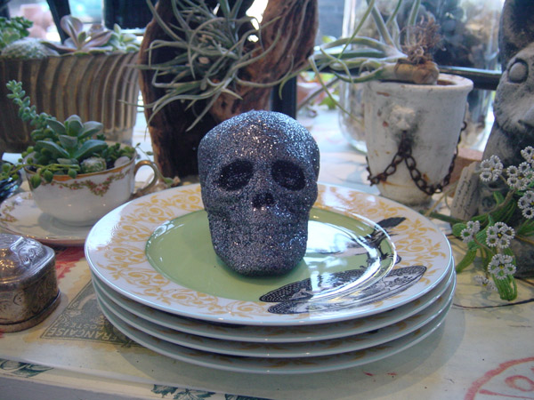 To me, a black glitter skull on a plate creates a whimsical vignette. I’ve never been the kind of person that likes disembodied zombies, tombstones, blood, spider webs or fake spiders for that matter. It’s just kind of morbidly unsexy to me.