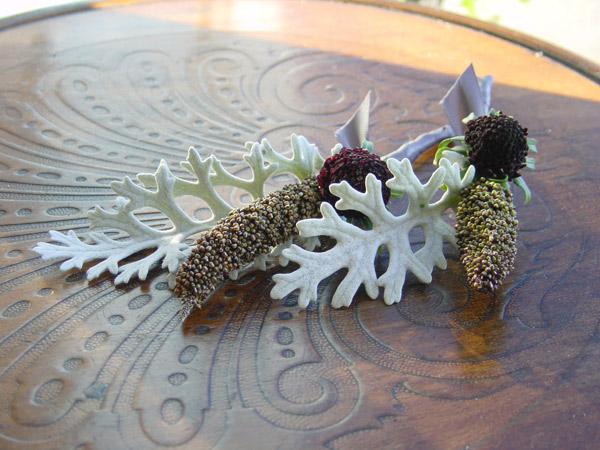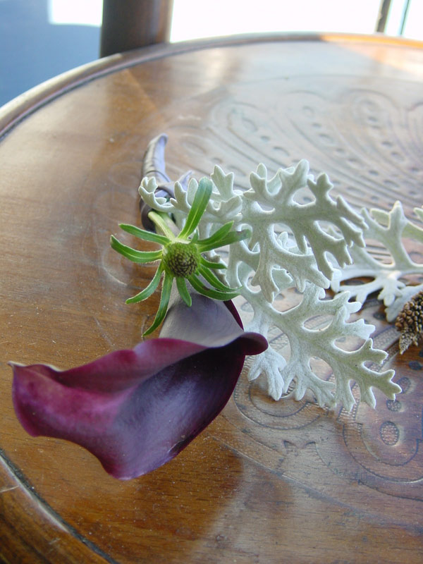 Cathy and Tim got married at the San Mateo Garden Center in San Mateo, CA. The wedding was an intimate ceremony that took place in a pretty little gazebo in a beautiful garden setting. The bride, a wonderfully laid back and non-traditional girl, wanted to keep the decorations to a minimum so we focused on the bridal bouquet, boutonnieres, and two arrangements to flank the couple as they said their vows.