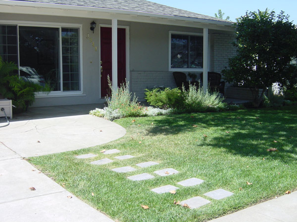 As a surprise for the husband, the wife asked me to freshen up the front yard while he was away on a business trip. One of the things he had mentioned to me was that he walked across the lawn near the edge of the driveway. I dug out the sod and dropped in 5″ thick pavers to create a new path. Using thinner pavers would have also worked, but I did not want to risk them shifting during the rainy season.
