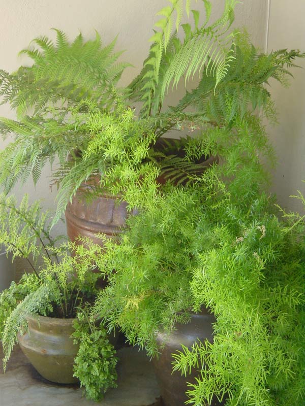 A trio of Mexican pots filled with a variety of ferns brightens a dark corner of the front patio.