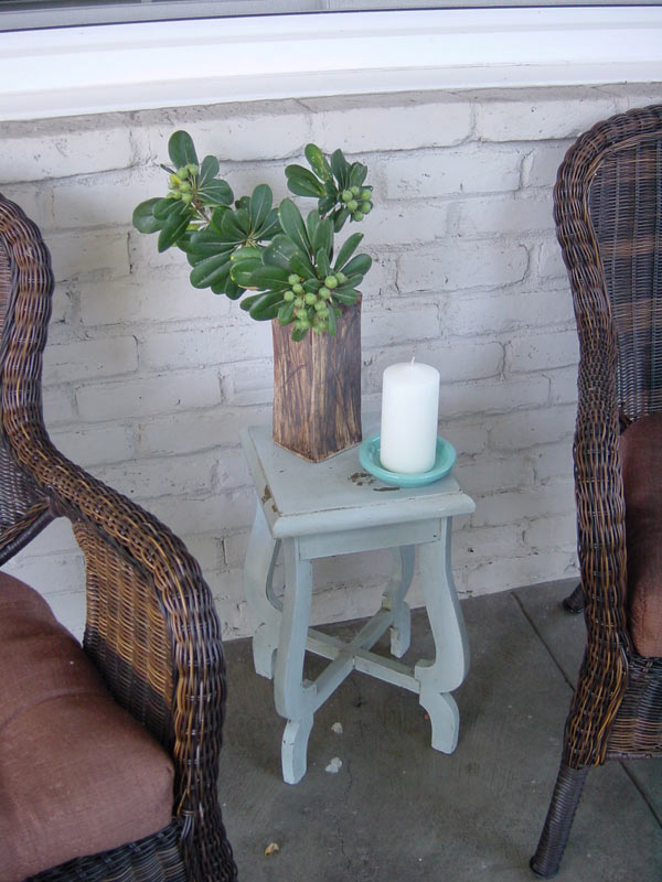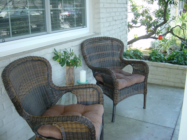 The husband wanted a place on the porch to read the paper/Kindle/laptop screen, so I got the most comfortable weather-resistant chairs I could find and positioned them behind the Camellia tree for privacy.